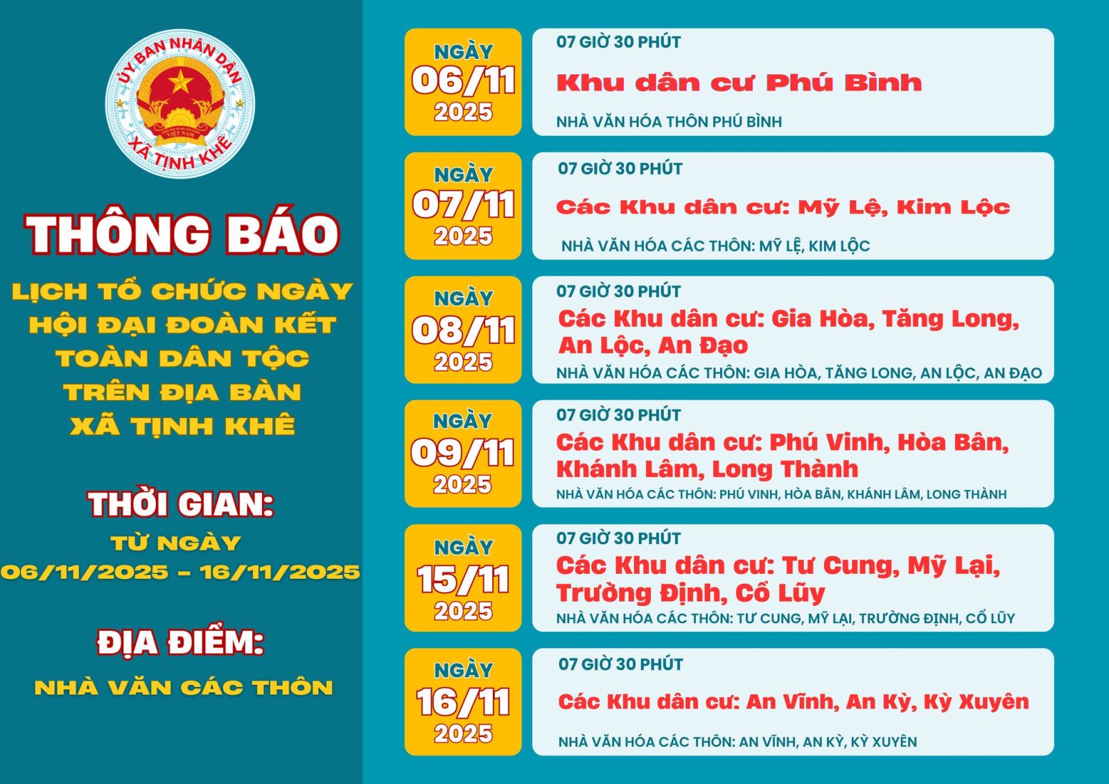 LỊCH TỔ CHỨC NGÀY HỘI ĐẠI ĐOÀN KẾT TOÀN DÂN TỘC TRÊN ĐỊA BÀN XÃ TỊNH KHÊ