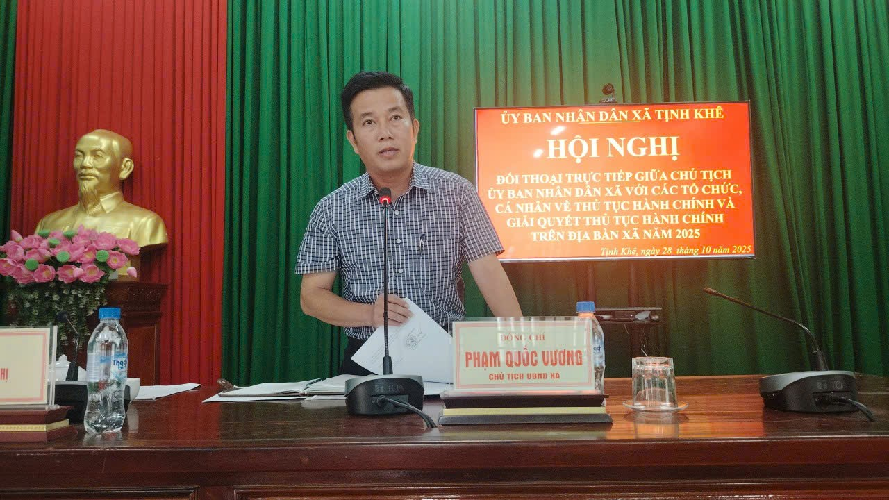Chiều ngày 28/10/2025, tại Hội trường UBND xã Tịnh Khê đã diễn ra Hội nghị đối thoại trực tiếp giữa Chủ tịch UBND xã Phạm Quốc Vương với các tổ chức, cá nhân về thủ tục hành chính và giải quyết thủ tục hành chính trên địa bàn xã năm 2025.
