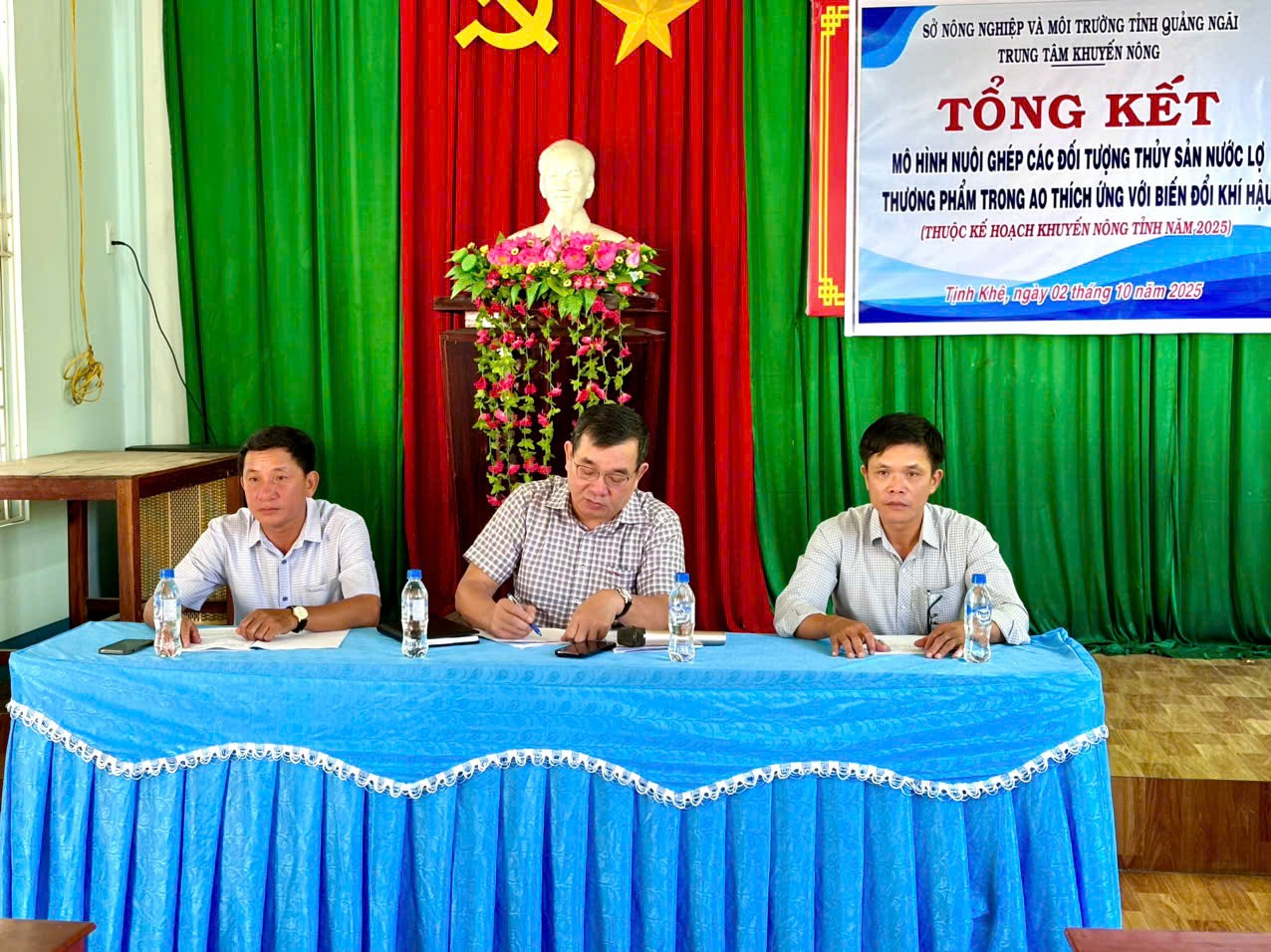 Chiều ngày 02/10/2025, Trung tâm Khuyến nông tỉnh Quảng Ngãi phối hợp với UBND xã Tịnh Khê tổ chức Hội nghị Tổng kết mô hình “Nuôi ghép các đối tượng thủy sản nước lợ thương phẩm trong ao thích ứng với biến đổi khí hậu” được triển khai thí điểm tại xã Tịnh Khê.